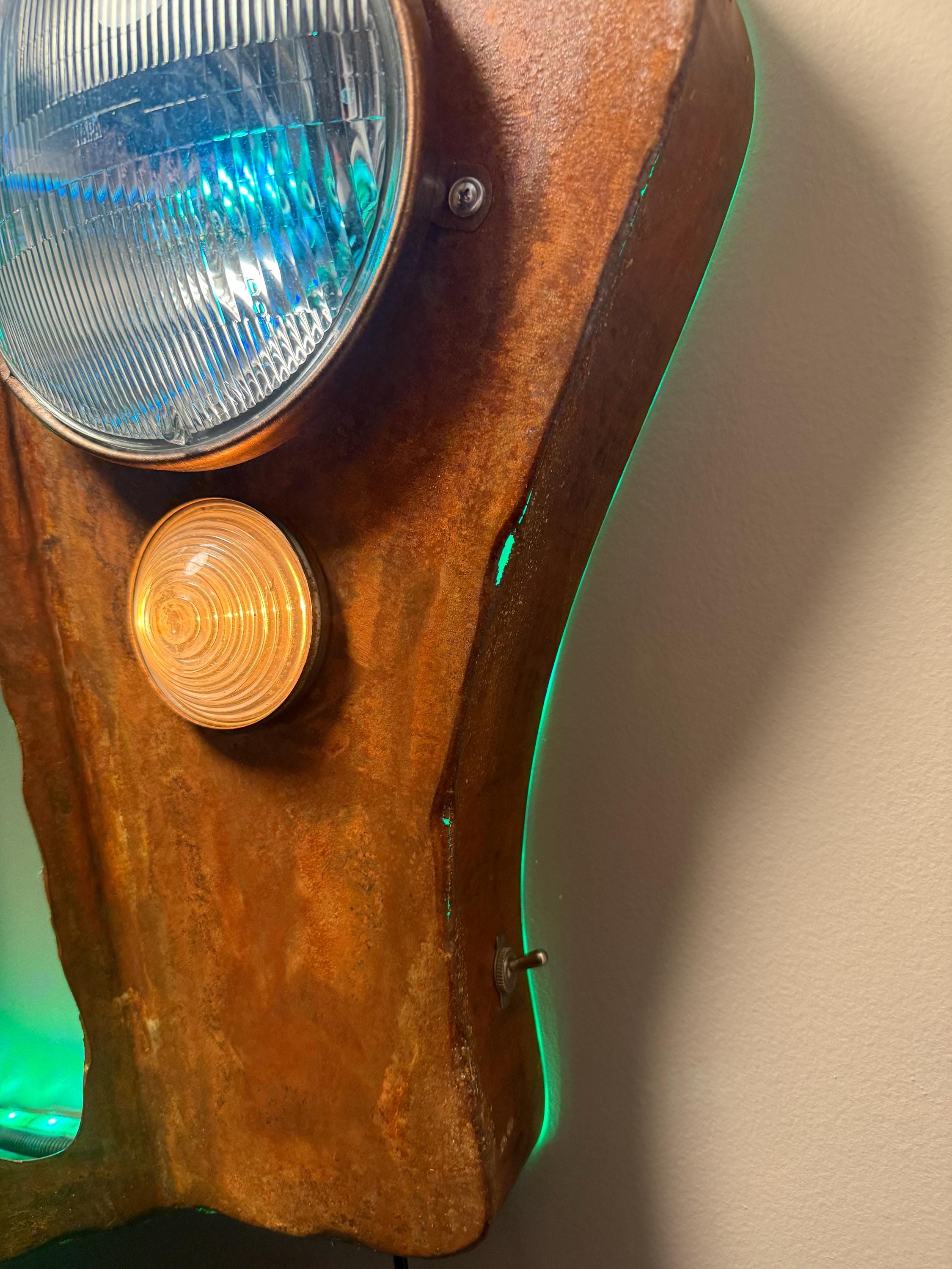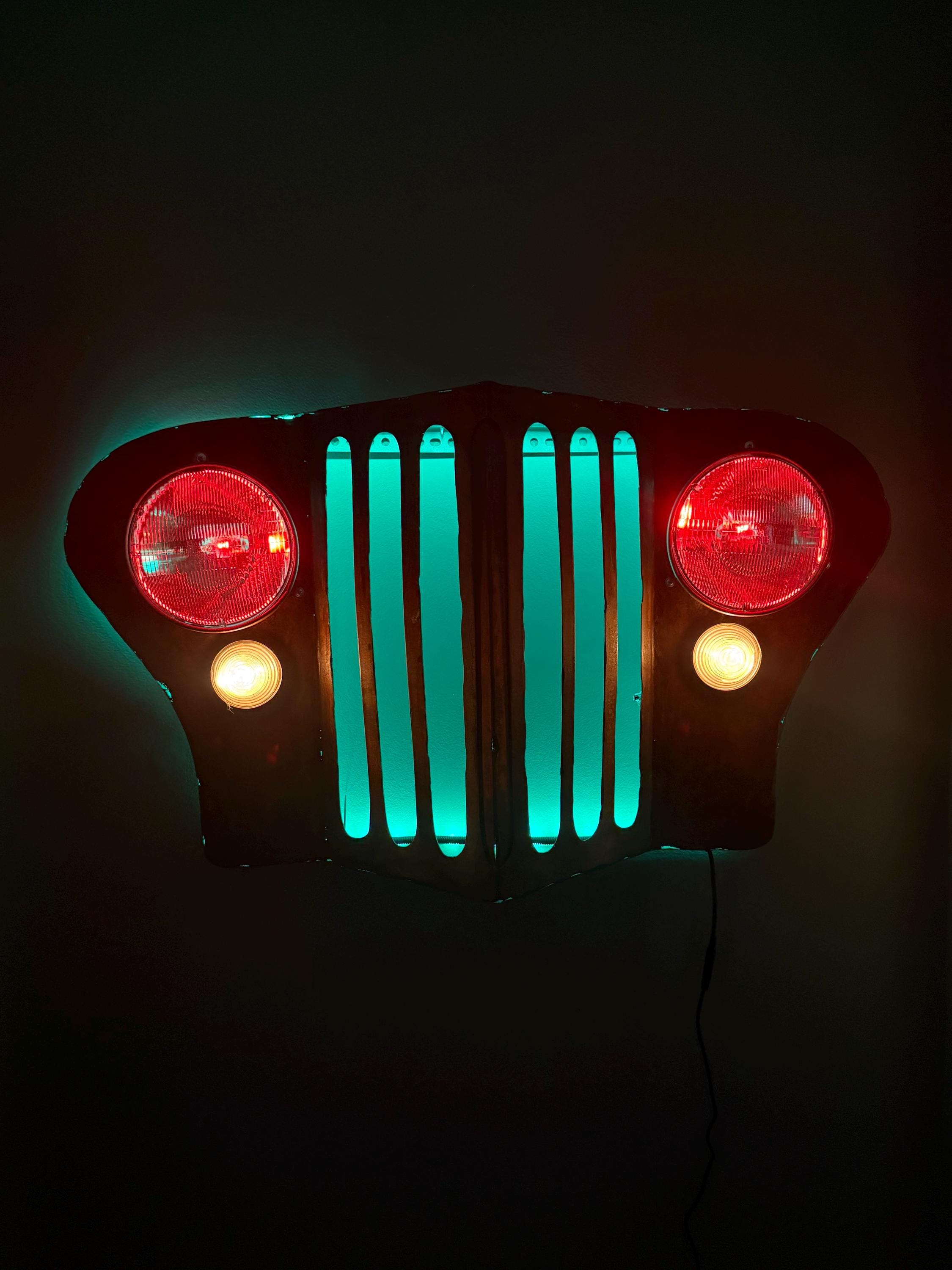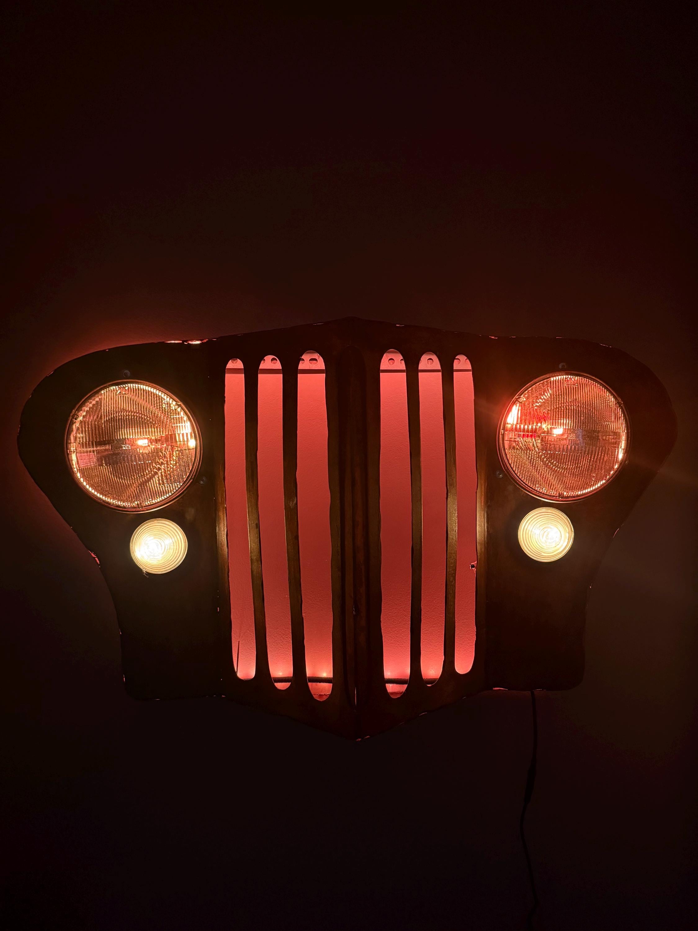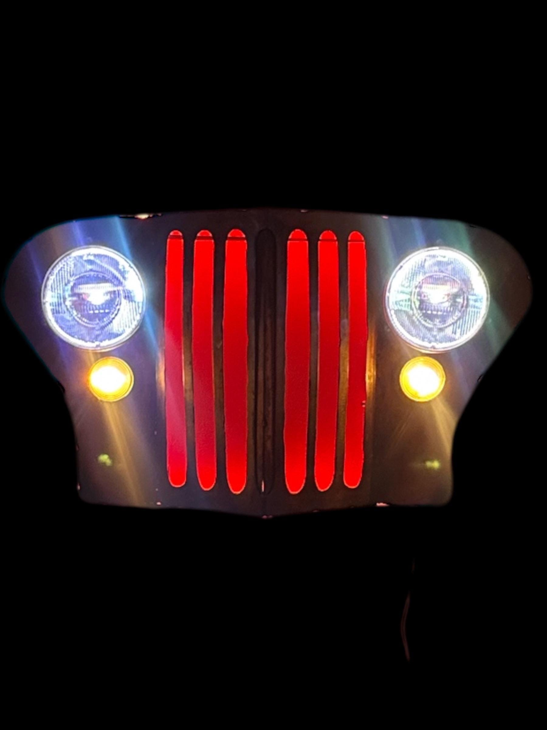 Willys Themed Jeep grill that has glass headlights and original park lights